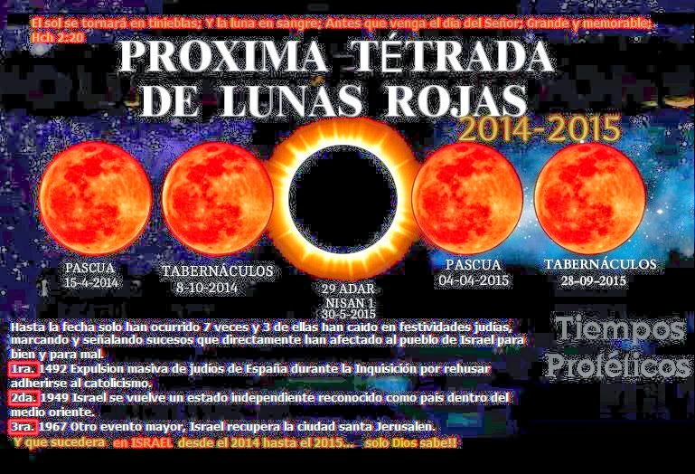 La humanidad está por asistir a la última tétrada con dos eclipses solares intercalados para el bienio 2014-15, que probablemente precederán a los eventos apocalípticos. Las dos anteriores tétradas acurrieron en los bienios 1949-50 (tras la independencia de Israel) y 1967-68 (esta última justo después de la Guerra de los 6 Días y la recuperación de Jerusalén); ¡pero la próxima tétrada no ocurrirá hasta 500 años más tarde!, allá para el 2614-15 en pleno Milenio).